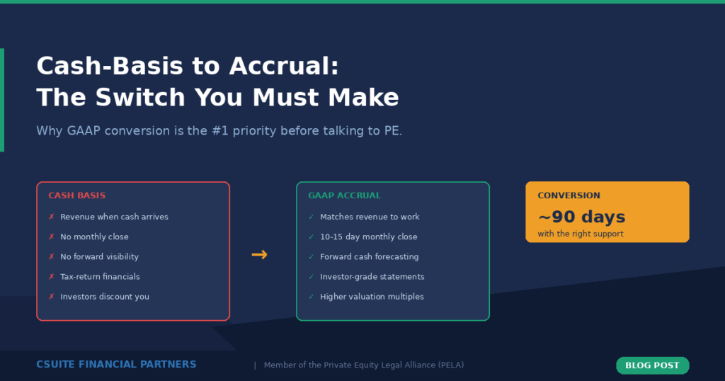 Private equity expects GAAP-compliant accrual reporting. That is non-negotiable. For personal injury firms, the gap between cash-basis and accrual is wider than in most industries because of how contingency-fee economics work.